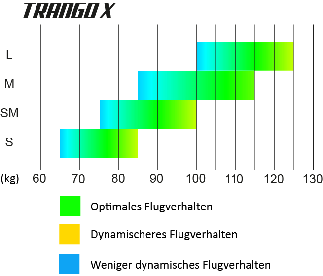 TRANGO! Ein Schirm. Ein Name. Eine riesige Fangemeinde weltweit. Nachdem bereits mit den TRANGO-Vorgängern von Generation zu Generation neue Klassenmaßstäbe gesetzt wurden, folgt nun mit dem TRANGO X endlich ein würdiger und lang ersehnter Nachfolger. Wenn du den TRANGO X-RACE geflogen bist, dann kannst du dir sicherlich die Mammutaufgabe vorstellen, vor der unser R&D Team stand, als es darum ging, weiter an der Performance-Schraube zu drehen, ohne dabei jedoch die Kerneigenschaften aus den Augen zu verlieren, für die unser Leistungsflügel weltweit hochgelobt wird: Handling, Stabilität, Thermikeigenschaften, Steigleistung… um nur einige der viel gerühmten Spitzen-Attribute aufzuführen. Nach etlichen Prototypen und unterschiedlichsten Konstruktionsansätzen ist es unserem R&D Team wieder einmal gelungen, einen Schirm zu bauen, den wir der großen Fangemeinde überaus stolz als würdigen Nachfolger der beliebten TRANGO-Serie präsentieren können! Der TRANGO X ist da - deine Chance auf die Überholspur zu wechseln!